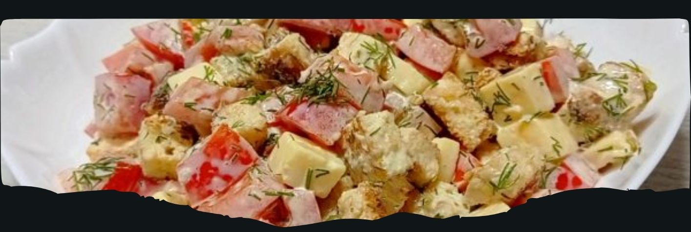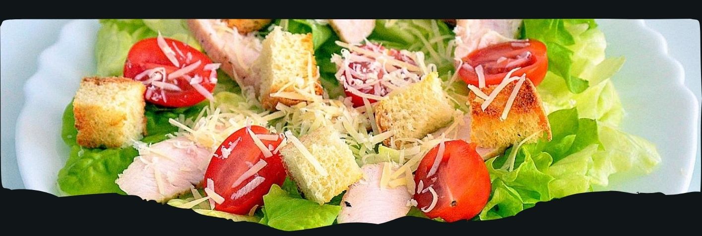 Жареные гренки, тертый пармезан, куриное филе, соус "Цезарь", анчоус, чеснок, горчица, лимонный сок, оливковое масло.