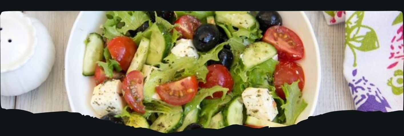 Листья салата, огурцы, помидоры, болгарский перец, красный лук, оливки, оливковое масло и лимонный сок.