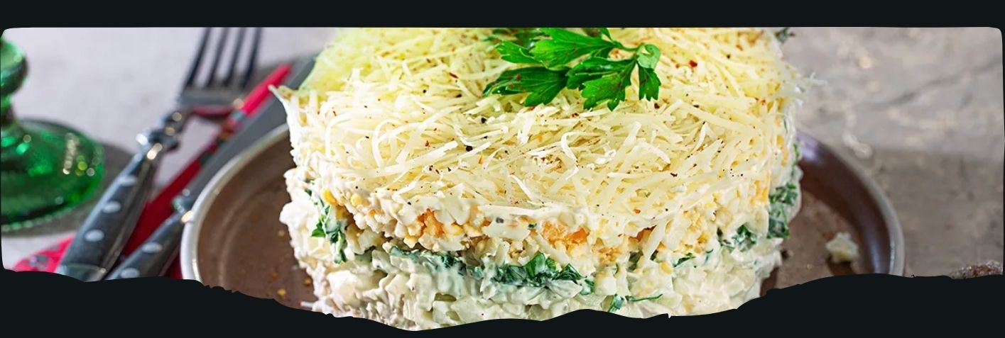 Консервированный тунец или другая рыба, вареные яица, картофель, морковь, сыр, лук, майонез и иногда отварной горошек.